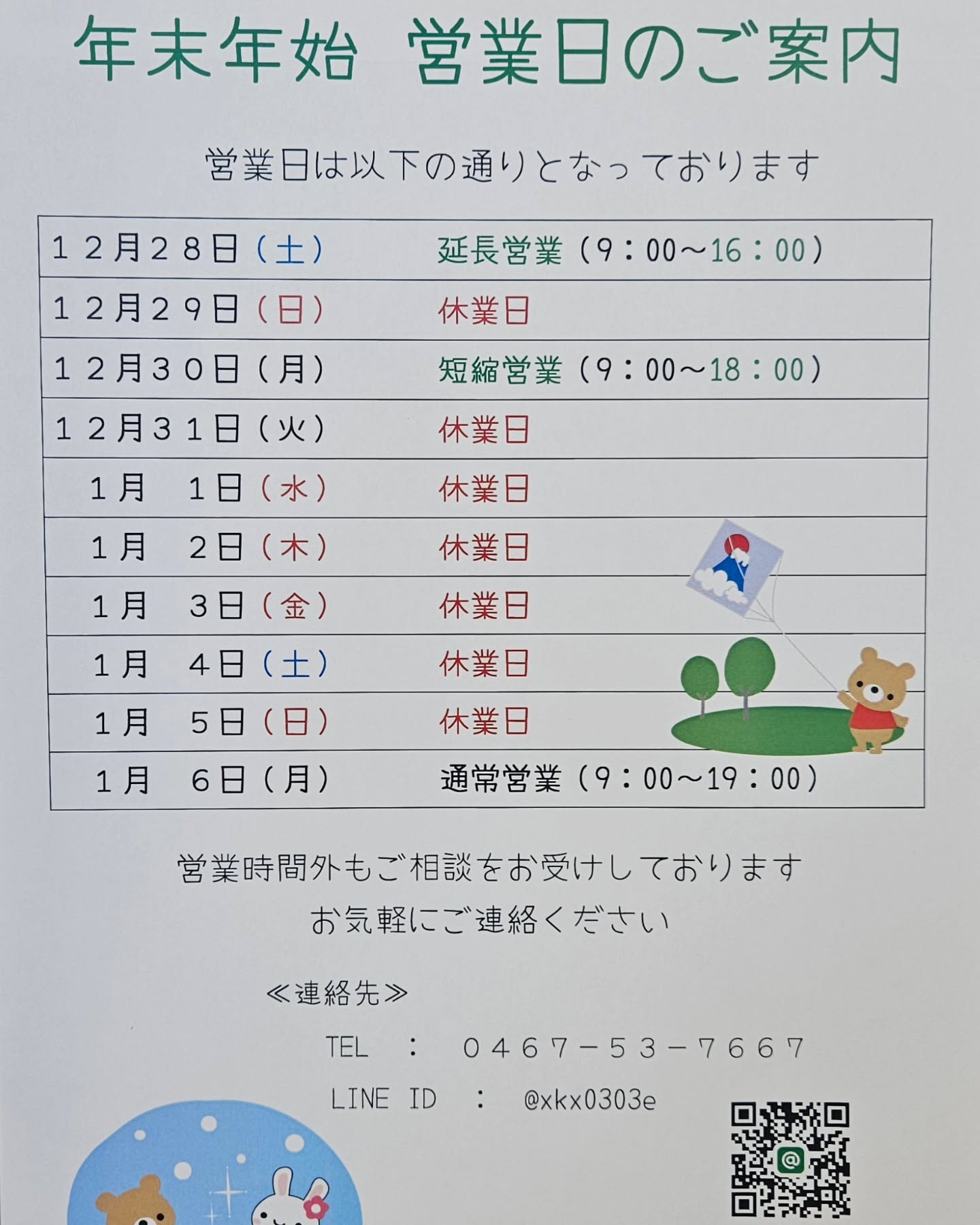 年末年始の営業時間です。 休業日も電話、LINEでのお薬のご相談をお受けしています。 いつでもご連絡ください。 #フレイズ薬局 #調剤薬局 #茅ヶ崎 #辻堂 #在宅薬剤管理 #居宅療養管理 #無菌調剤 #緩和ケア #頼れるまちの薬屋さん #365日、24時間、お薬のご相談OK