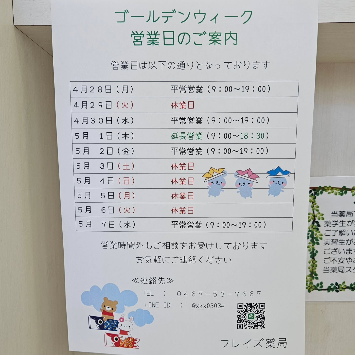 GWの営業時間です。 休業日も電話、LINEでのお薬のご相談をお受けしています。 いつでもご連絡ください。 #フレイズ薬局 #調剤薬局 #茅ヶ崎 #辻堂 #在宅薬剤管理 #居宅療養管理 #無菌調剤 #緩和ケア #頼れるまちの薬屋さん #365日、24時間、お薬のご相談OK