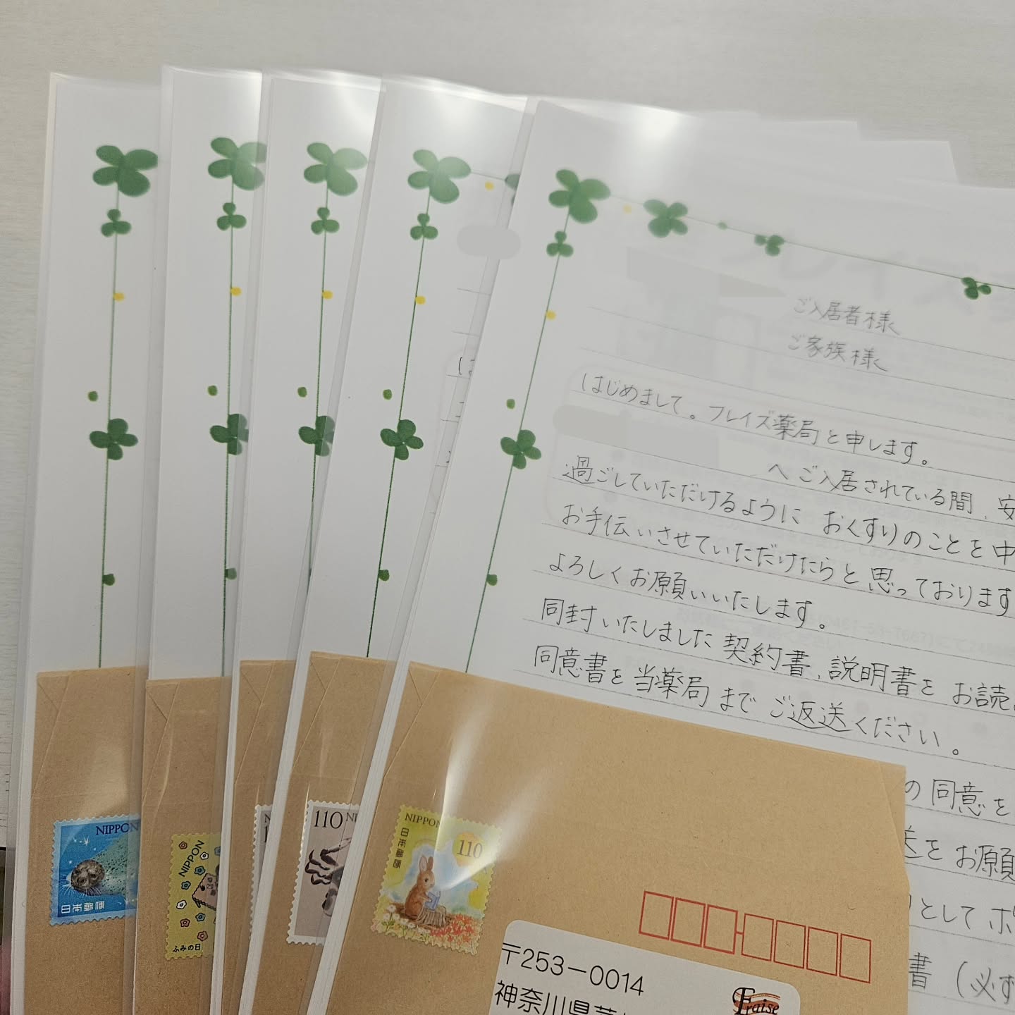 今日は担当させていただいている介護サービス付き高齢者住宅の往診同行日でした。 医師、クリニック看護師、施設看護師、薬剤師で、患者さんのお部屋に伺っています。 患者さんのお話を伺って、ご様子、バイタル、検査値、お部屋の様子(室温や、テレビの音量、証明の明るさ、整頓の具合などなど)を考慮して、処方設計に参加。 月に4回の往診同行で、患者さんや他職種の皆さんに学ばせていただいていて、薬剤師として全力でお返ししています(*^^*) この施設を初めて担当させていただいたのは、次男が生後6ヶ月の時でした。その次男も来月11歳。 長く担当させていただけて、感謝しています。 もっと、もっと、頑張るぞ! ※画像は居宅療養管理の契約書 #フレイズ薬局 #調剤薬局 #茅ヶ崎 #辻堂 #在宅薬剤管理 #居宅療養管理 #無菌調剤 #緩和ケア #頼れるまちの薬屋さん #365日、24時間、お薬のご相談OK